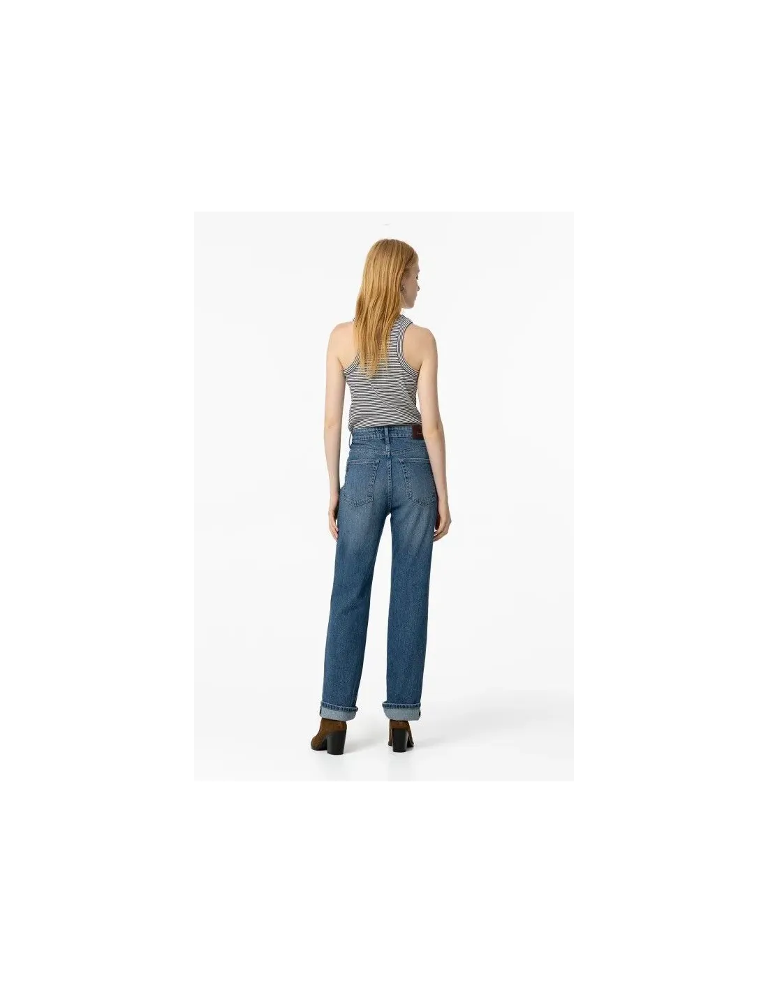 Jeans de tiro alto y pernera recta con cinco bolsillos. Cierre frontal con cremallera y botón metálico.