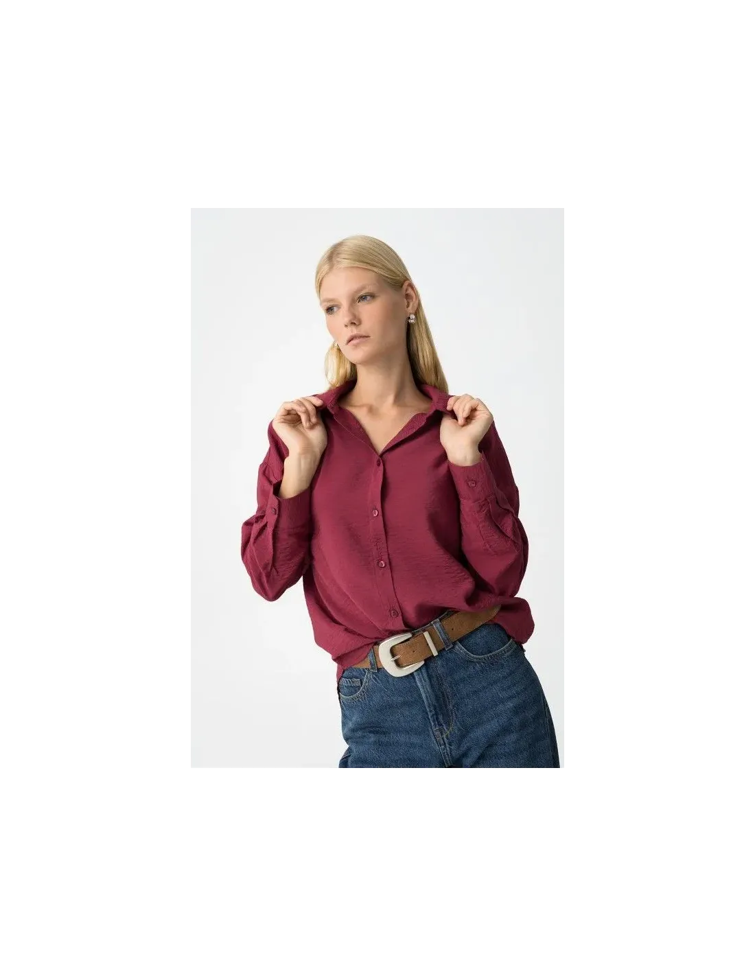 Esta camisa relaxed fit de tejido texturizado, mezcla de viscosa y poliamida, es tan ligera como poderosa. Con apertura frontal de botones, cuello clásico, manga larga con puños abotonados y bajo curvo asimétrico, se adapta a tu cuerpo y a tu ritmo sin apretar ni marcar.