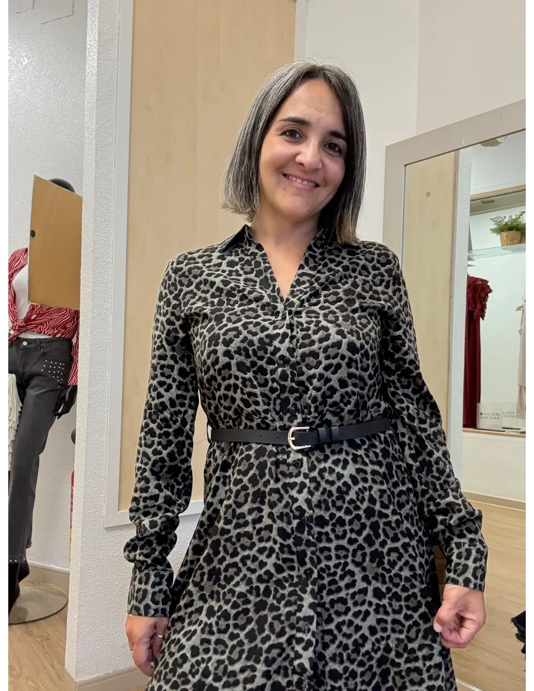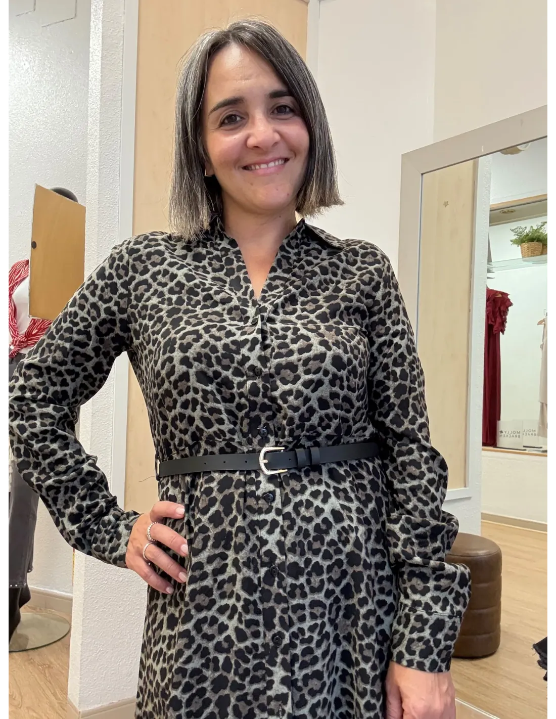 👗 Analoa mide 1,59 m y usa talla S. El corte es recto pero favorecedor, y el cinturón te permite ajustarlo a tu estilo o cuerpo.