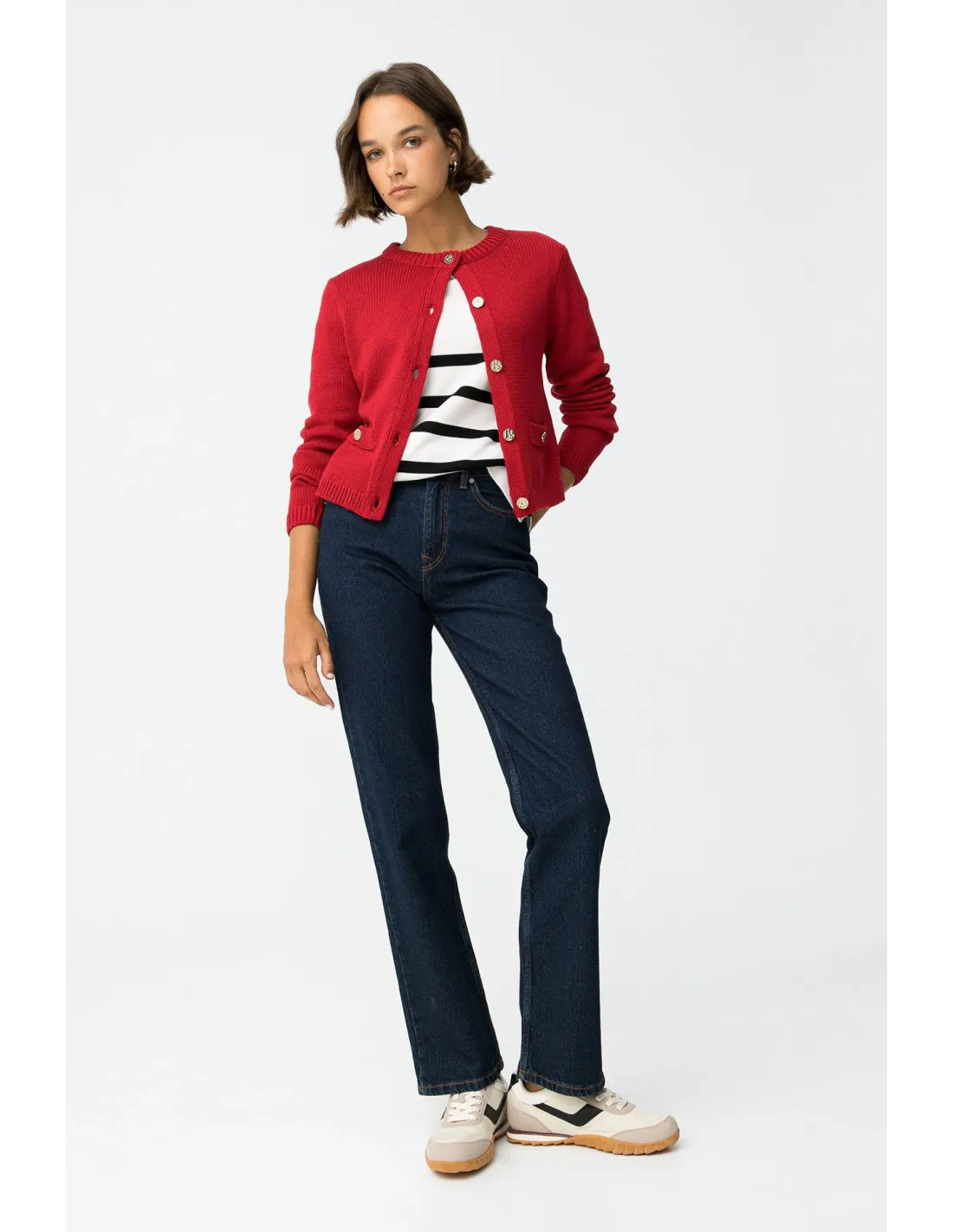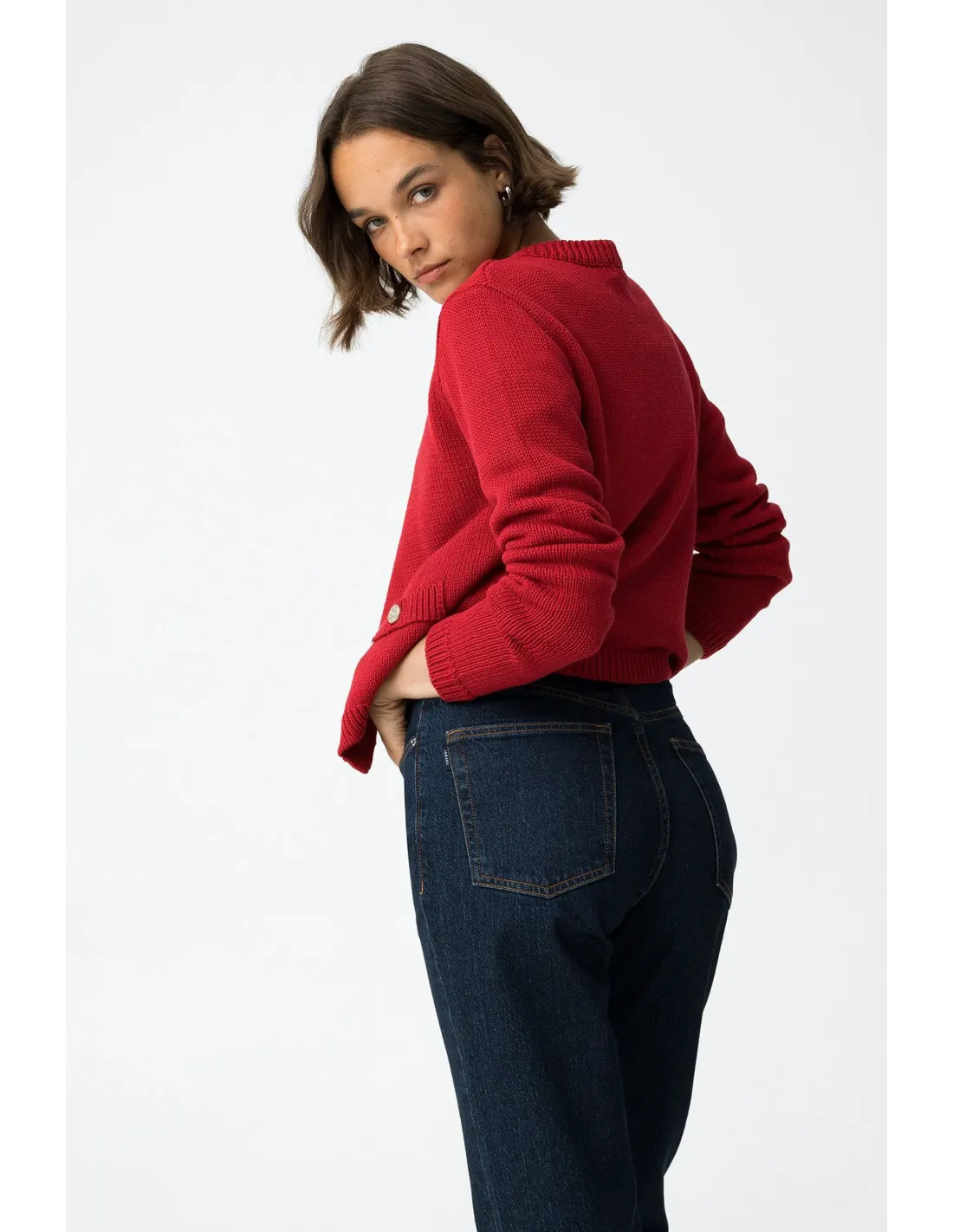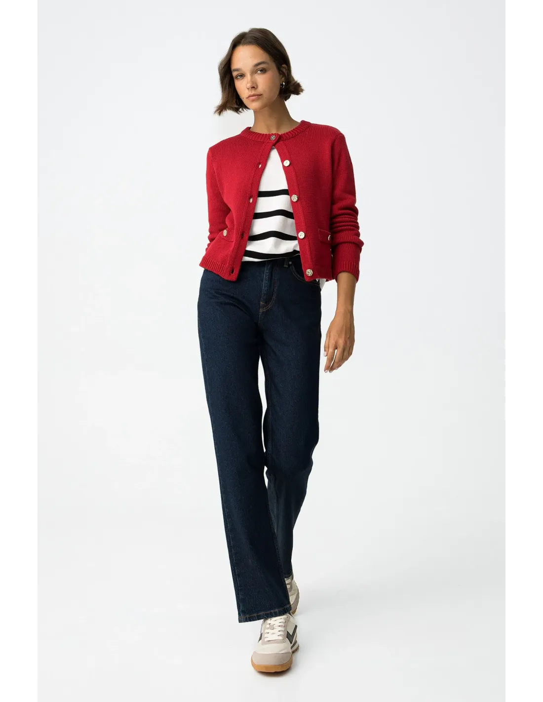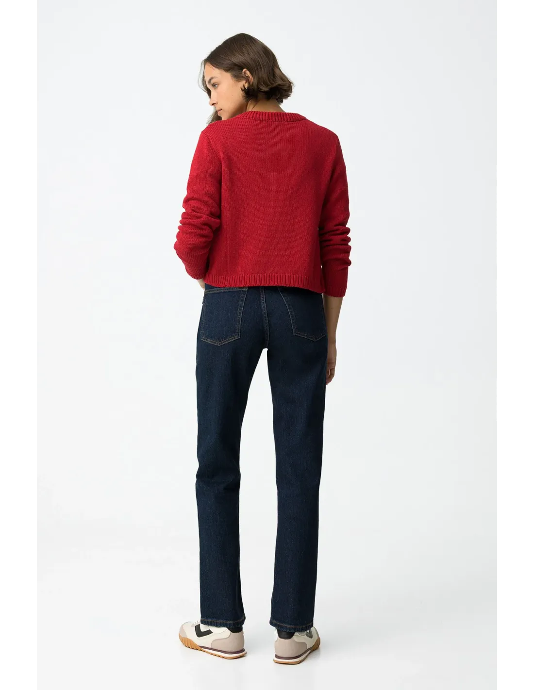 Estos vaqueros de pierna recta y cintura alta, en un profundo tono azul índigo oscuro, son un fondo de armario moderno. Con cinco bolsillos clásicos, abertura frontal con cremallera y botón metálico, y un fit comfort que abraza sin apretar, te acompañan con estilo de lunes a domingo.