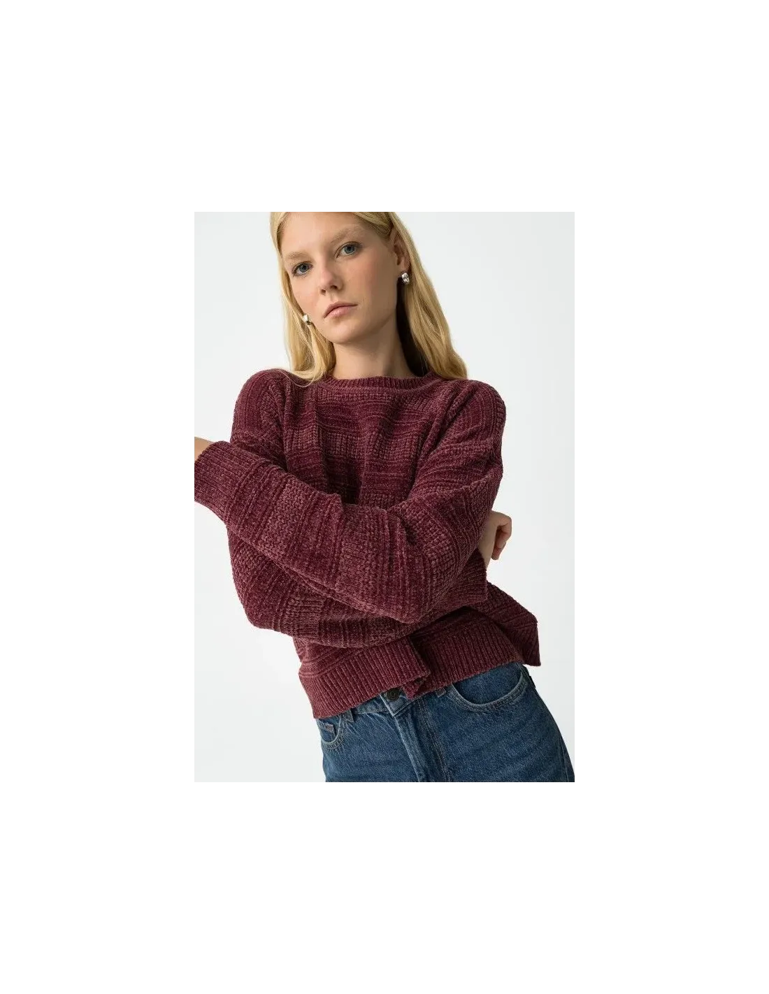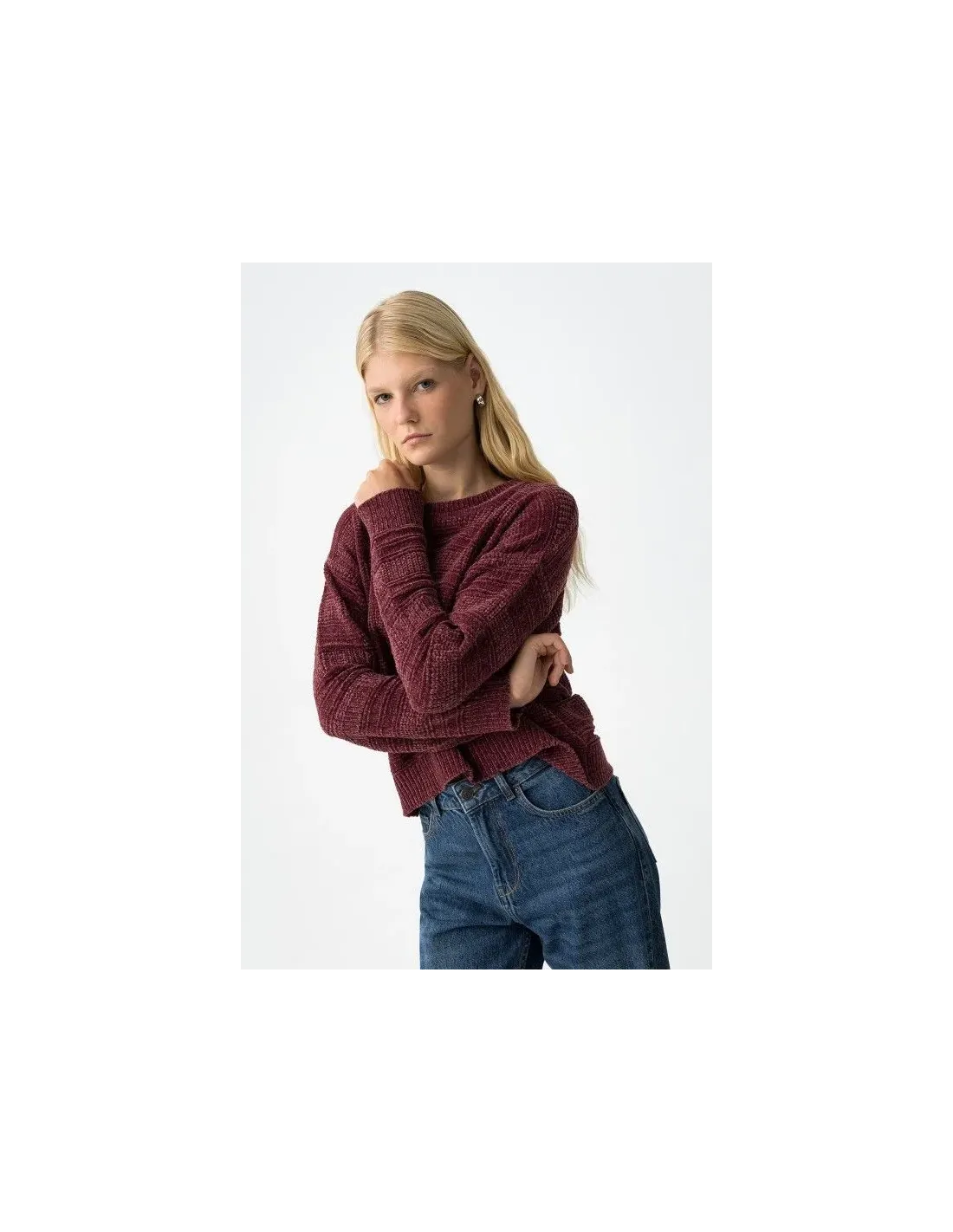 Confeccionado en hilo aterciopelado de chenilla, este jersey de corte relaxed es tan cómodo como favorecedor. Su diseño a rayas en tono burdeos aporta un aire invernal y moderno, mientras que el escote redondo y las mangas largas lo convierten en un básico versátil para combinar con vaqueros, faldas o pantalones anchos.