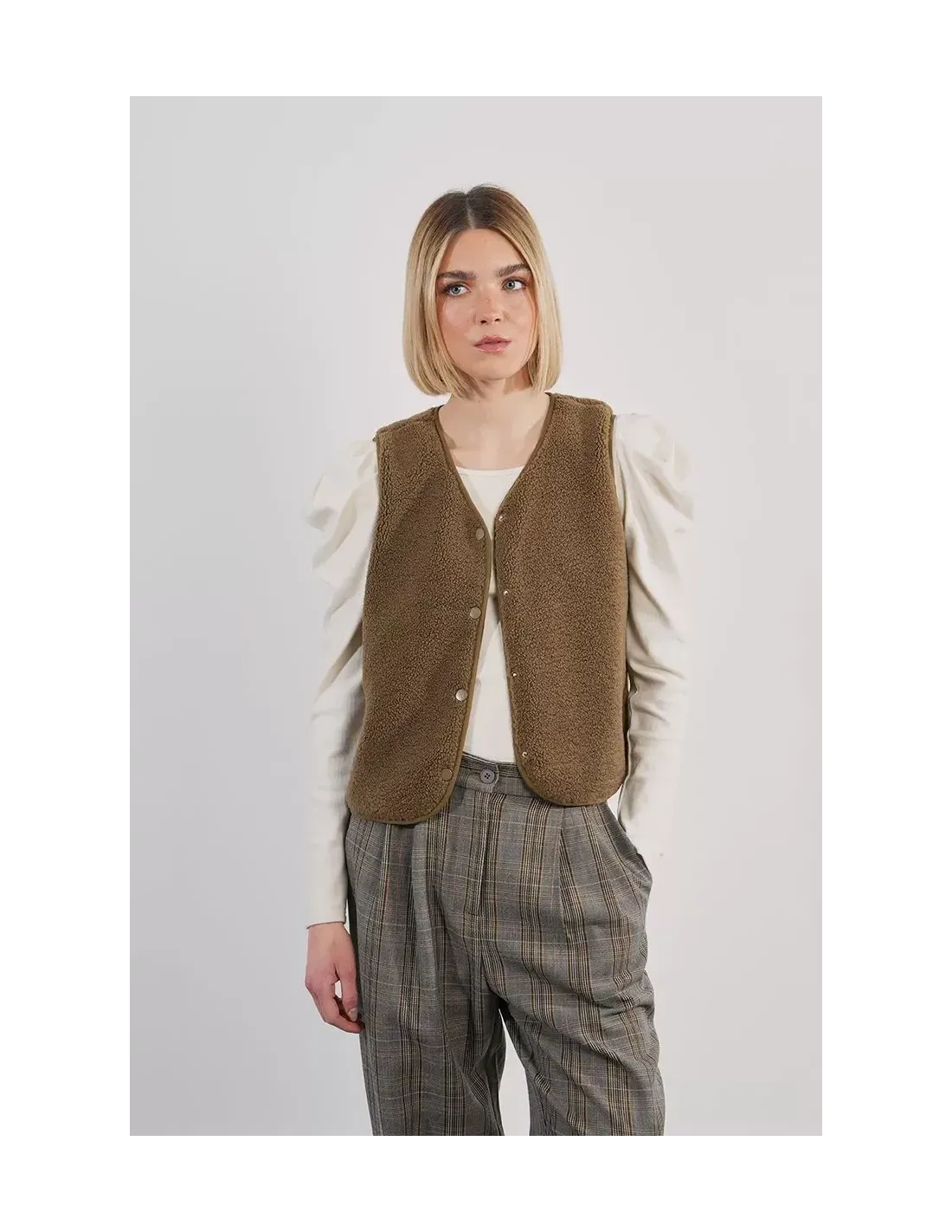 Este chaleco corto en tejido efecto peluche es tan suave como versátil. De cuello en pico, corte recto y cierre de botones frontales, es perfecto para llevar como prenda protagonista o en capas sobre camisas y jerseys finos. El tono kaki lo convierte en un básico fácil de combinar con tonos neutros o tierras.